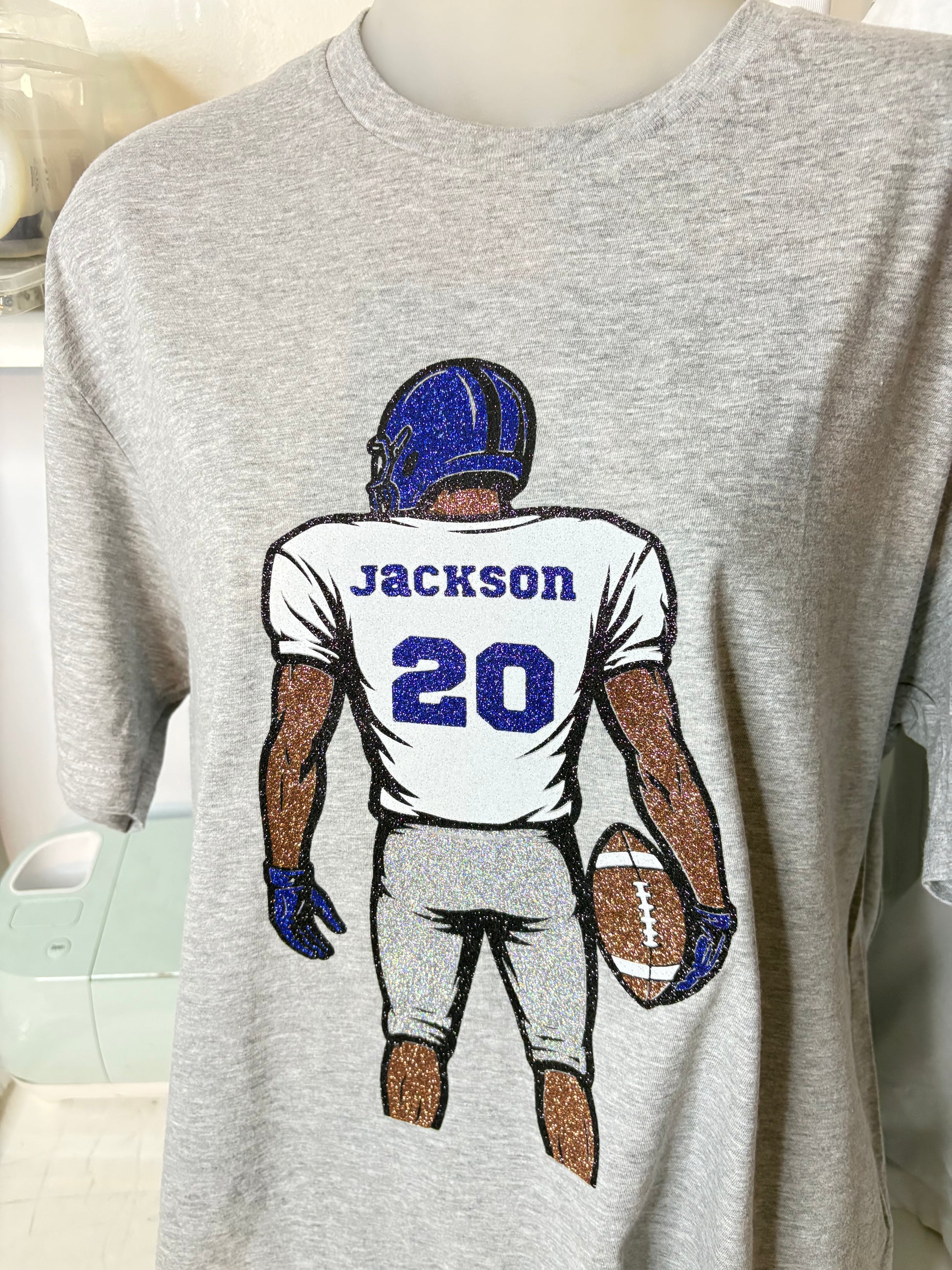 Show off your love for your favorite football player with our Custom Football Player Tee. This t-shirt is perfect for sports moms, dads, and fans. Get yours personalized today and stand out from the crowd. Show your team spirit in style!
